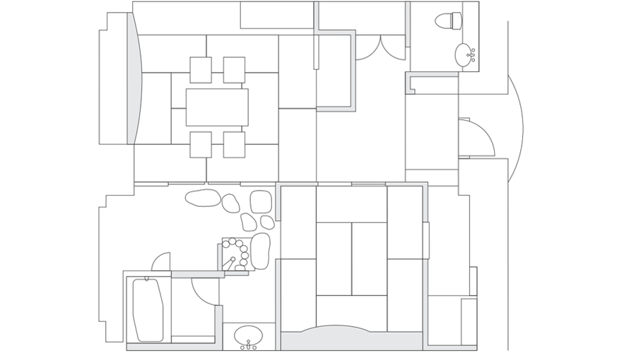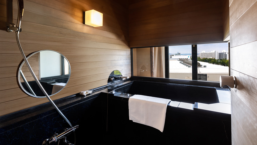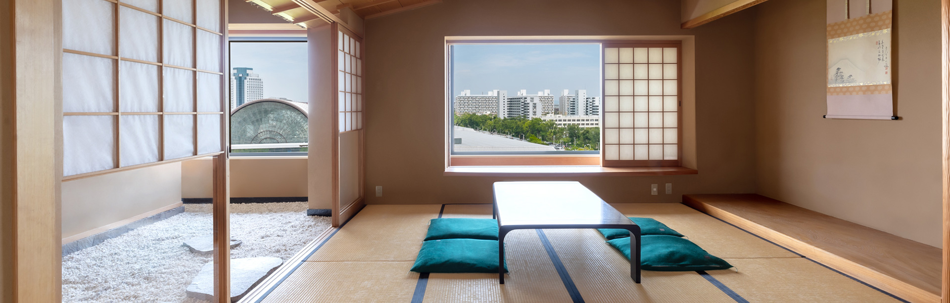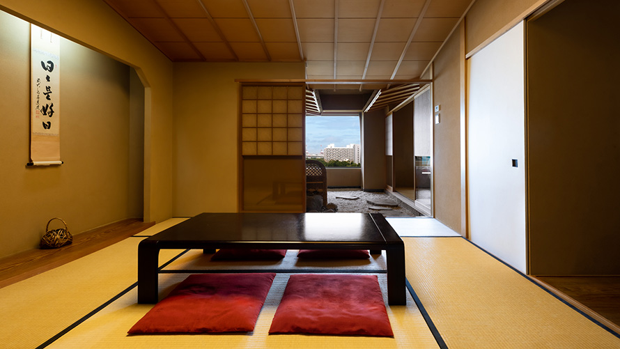 落ち着いた「和」の空間をお愉しみいただける90㎡の和室には、くつろいだ畳の寝室、坪庭、檜を用いた浴室をご用意しております。