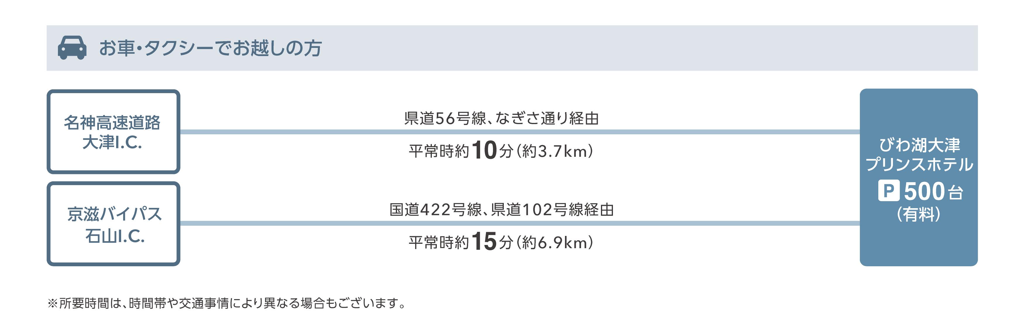 東京から 小牧I.C.から 豊中I.C.から 東名・名神高速道路 大津I.C.まで475km 名神高速道路 大津I.C.まで127km 名神高速道路 大津I.C.まで50km JR大津駅からタクシーご利用の場合:平常時約10分