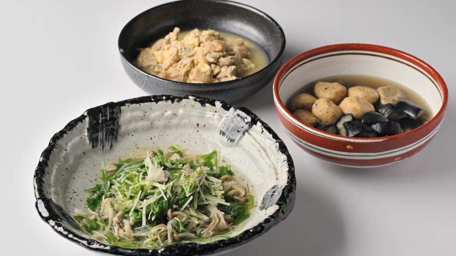 〇 おばんざい(水菜ときのこのお浸し、八幡蒟蒻の金平、お刺身八幡蒟蒻、丁子麩とかしわの玉子とじ)