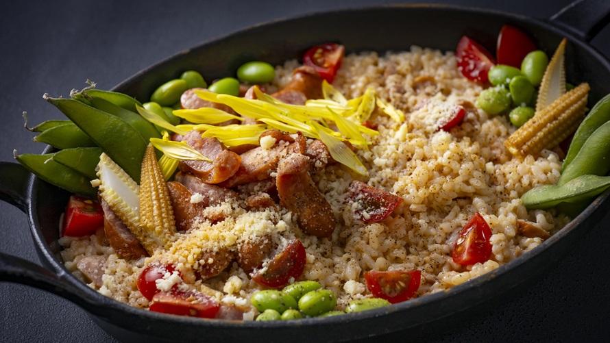 ■金芽ロウカット玄米を使った魚介と枝豆のクリームリゾット サフラン風味