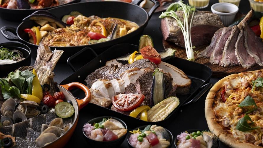 「彩」をテーマに夏の暑さに負けない、多彩な味覚のディナーブッフェをご用意いたしました。彩り豊かな夏野菜とともに味わう近江鶏の天火焼きは、スパイシーな柑橘風味のタンドリーソースで、食欲を刺激する一品。ほかにも、焼きたてでご用意するチョリソーとパプリカのスパイシーピザや低温で柔らかく仕上げた人気のローストビーフなど。和・洋・中のバラエティ豊かな味覚を滋賀県産の食材とともにお楽しみください。