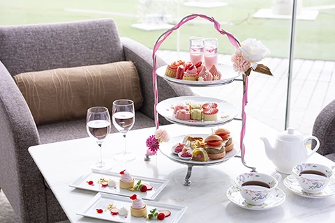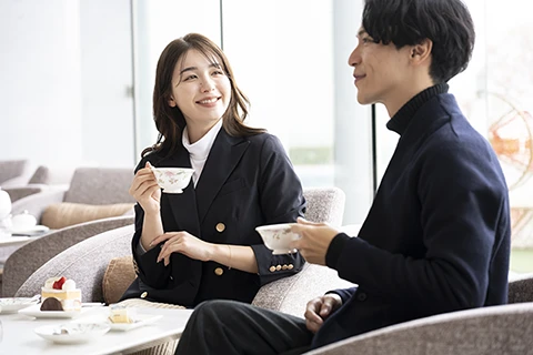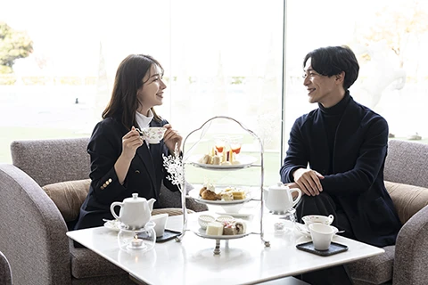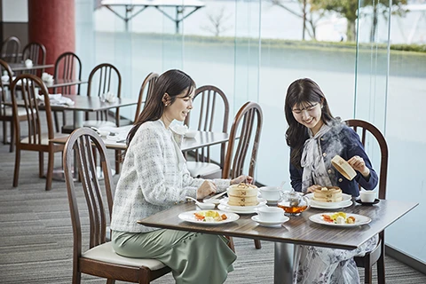 びわ湖を望む開放的なラウンジで、お好きなスイーツや紅茶とともに