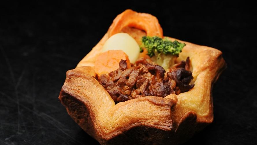 デニッシュ生地のカップに、マッシュポテトとビーフシチューを詰めて焼き上げた、冬にぴったりのあたたかい味わいです。