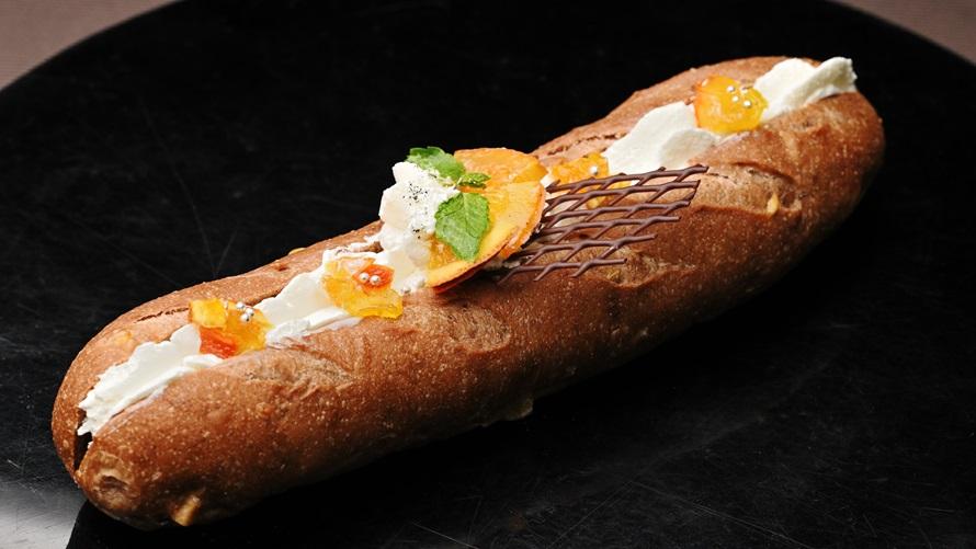 ナッツとオレンジピールを練り込んだバゲット生地に、ホワイトチョコレートとオレンジピールのクリームをたっぷりと重ねました。