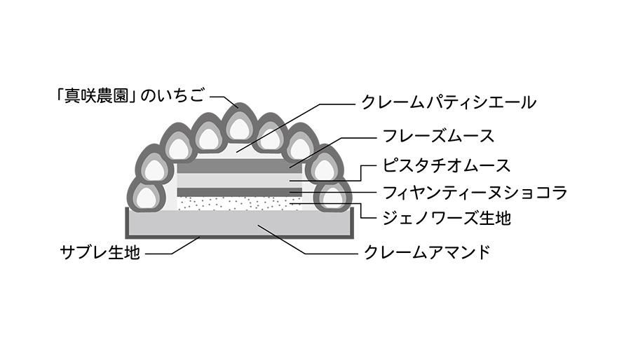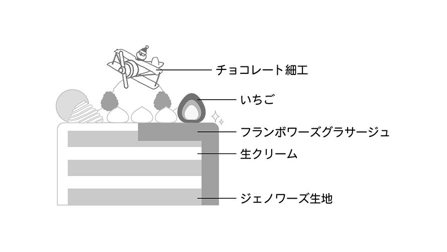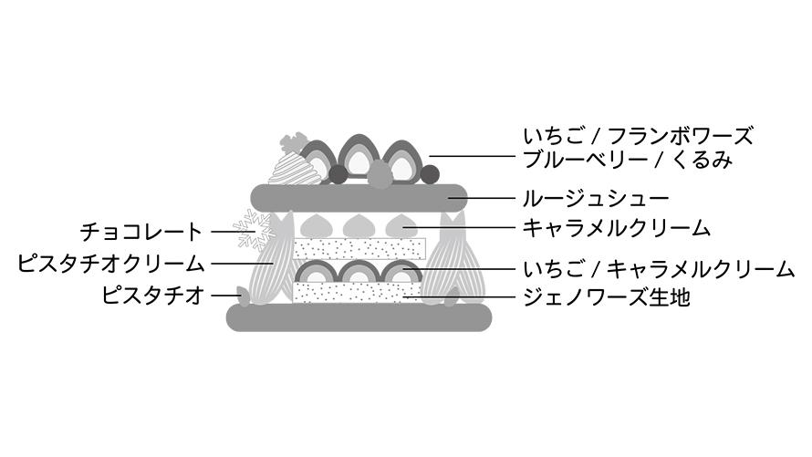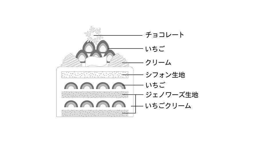 軽くてきめ細かいシフォン生地と、しっとりとしたジェノワーズの2種類の生地に、コクのあるクリームを重ねました。いちごのほどよい酸味がアクセントになった、シンプルながらも魅力が詰まったケーキです。