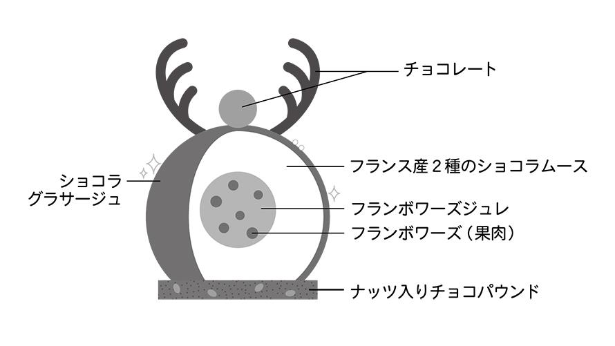 2種類のフランス産ショコラを使用した、濃厚でなめらかなムースの中に、フランボワーズジュレを閉じ込め、ショコラの奥深さを際立てます。ナッツの食感が楽しいチョコレートパウンドを土台に、トナカイをモチーフにしたチョコレート細工が聖夜を華やかに彩ります。