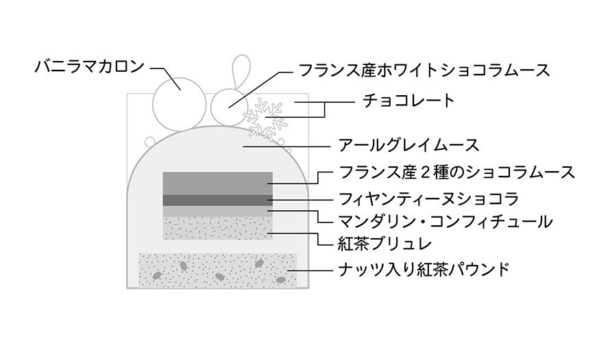 雪化粧をイメージした心が華やぐケーキです。アールグレイが優雅に香るムースの中に、紅茶