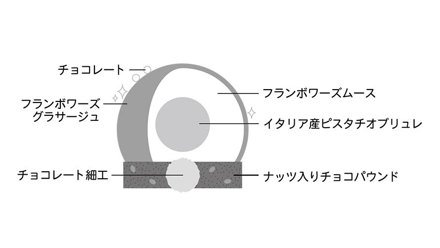 艶やかなグラサージュで包んだフランボワーズムースの中に、濃厚なイタリア産ピスタチオのブリュレを忍ばせました。甘酸っぱいフランボワーズとの絶妙なハーモニーが広がります。土台にはナッツの食感が楽しいチョコレートパウンドを使用し、サンタクロースをイメージしたチョコレート細工がクリスマス気分を盛り上げます。