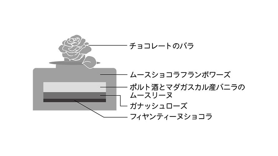 真っ赤なチョコレートのバラを飾った華やかなケーキ。フランボワーズとフランス産チョコレートを組み合わせたムースショコラの中に、ポルト酒とマダガスカル産バニラのムースリーヌ、ガナッシュローズを包み込み大人の味わいに仕上げました。