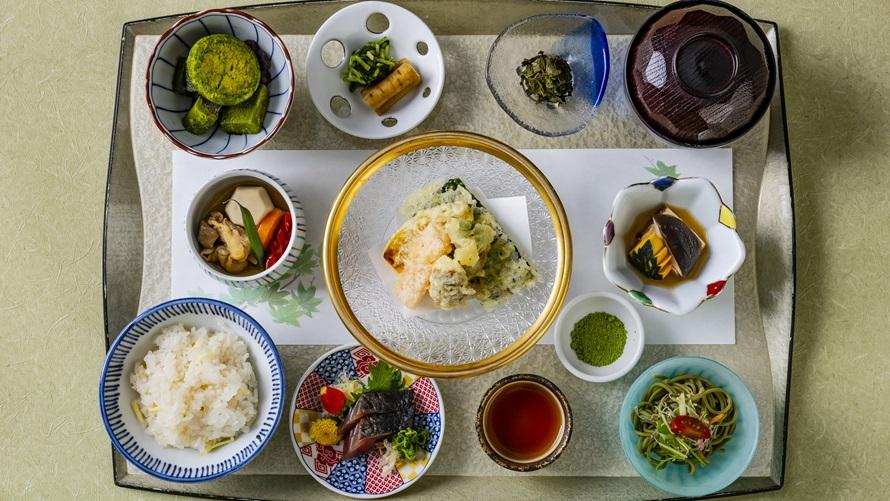 旬の鰹は、香り高くお茶で燻した燻製でご用意。近江鶏の番茶煮や滋賀県野菜の天婦羅など、近江の味覚も取り揃えた涼やかな花御膳を、びわ湖の絶景とともにご堪能ください。