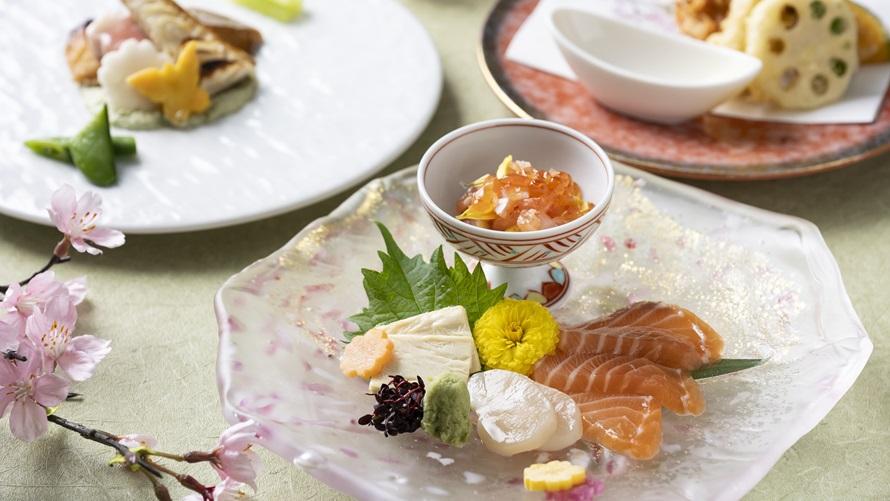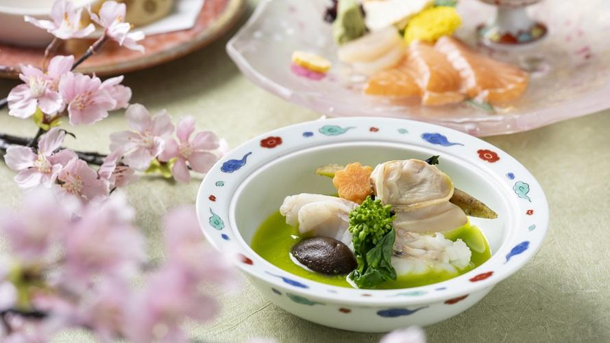 春の息吹を一皿一皿に映した、祝席にふさわしい旬会席です。桜胡麻豆腐や醒井養鱒場のニジマス、筍、蛤など春の恵みを用い、香り・彩り・旨味を大切に仕立てました。桜海老のかき揚げや鰆と筍の木の芽味噌焼きなど、心華やぐ味わいが、門出やお祝いの席を優しく彩ります。