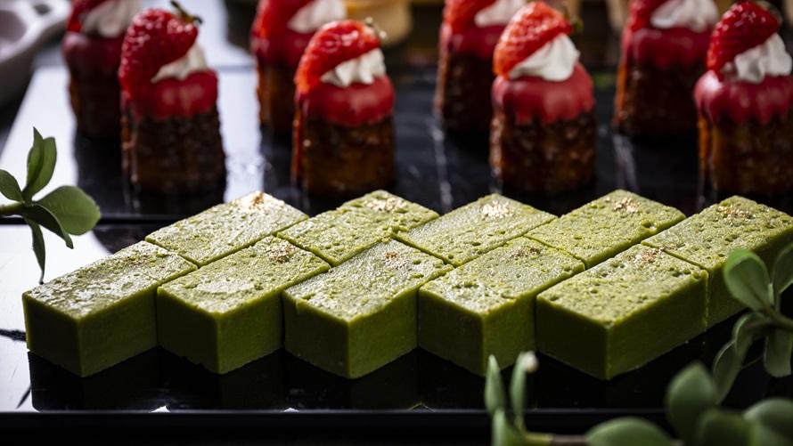 今年はストロベリー&抹茶スイーツブッフェを開催いたします。滋賀県初のオリジナルいちご「みおしずく」を使用したいちごのスイーツをはじめ、見た目も愛らしいまるでいちごムース、土山抹茶のクレームブリュレやテリーヌなど、華やかで個性豊かなスイーツが勢ぞろい。さらに、抹茶のモンブランを目の前で仕上げるライブパフォーマンスもお楽しみいただけます。いちごの甘味と抹茶のほろ苦さが織りなす多彩なメニューを、びわ湖の絶景を眺めながら心ゆくまでご堪能ください。