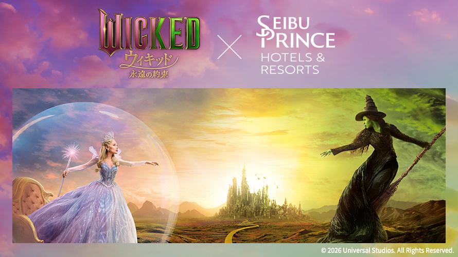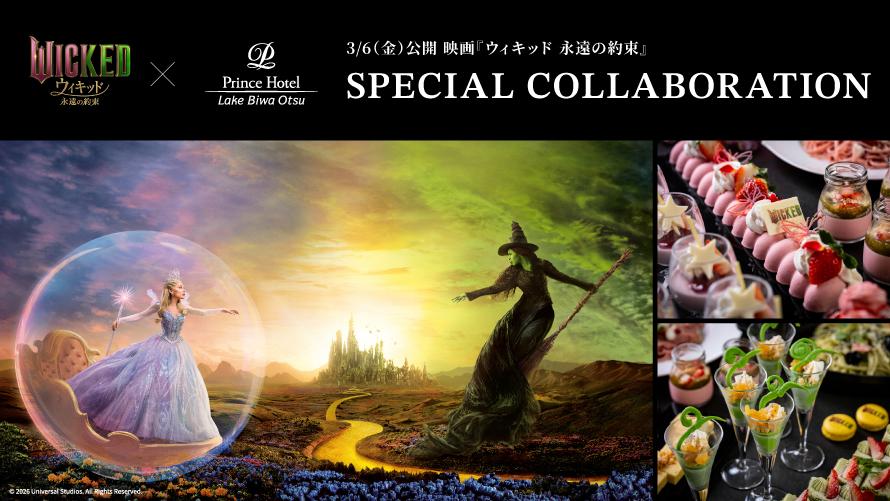 エルファバとグリンダをイメージし、グリーンとピンクを基調とした特別なコラボレーションルームが登場。お部屋の壁面には、映画の舞台となる“黄色いレンガの道”をモチーフにしたタペストリーが飾られ、さらにエルファバの魔女の帽子やグリンダのティアラもご用意しました。映画『ウィキッド 永遠の約束』の世界観を存分に味わえるご宿泊者さま限定のプライベート空間で、ゆったりとくつろぎながら、特別な記念撮影もお楽しみください。
