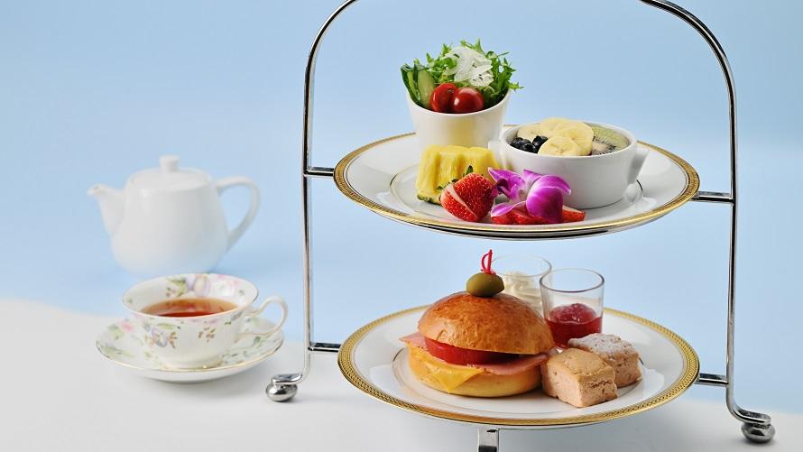 フルーツとミックスサンド、2種のスコーン、オレンジジュース、コーヒーまたは紅茶が付いたセットメニュー。Webサイトよりご予約いただくと、お飲みものが90分のフリードリンクとなります。びわ湖の絶景とともにゆったりとしたご朝食をお楽しみください。