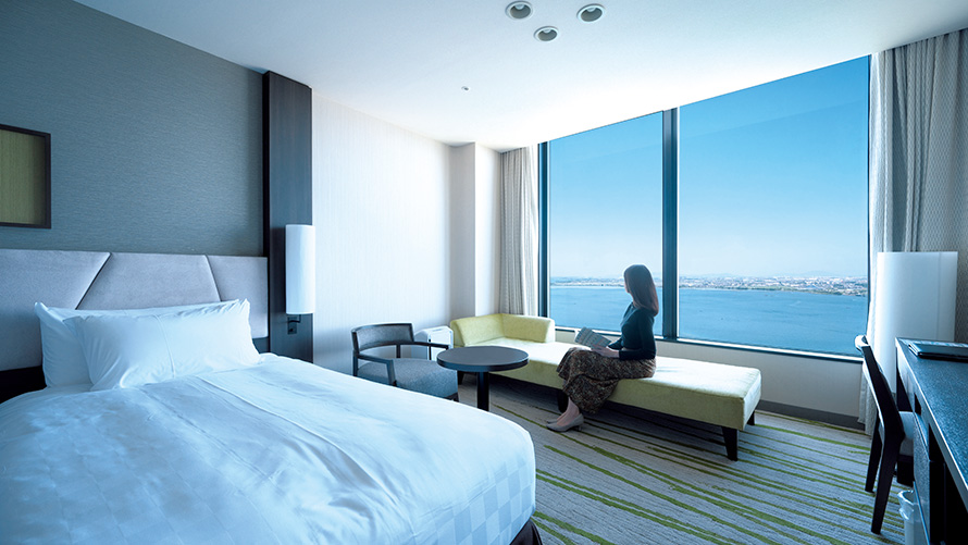 高層階の33~35Fに位置するEIZANフロアの客室は、窓一面に広がるびわ湖の風景が四季のくつろぎを演出します。