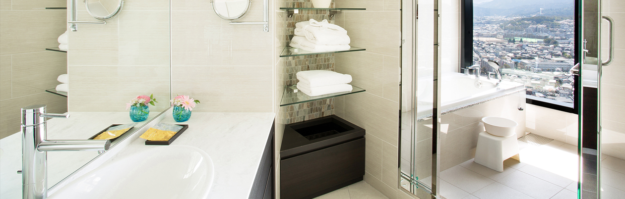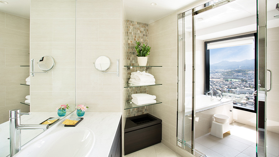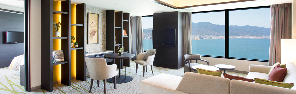 高層階の33~35Fに位置するEIZANフロアの客室は、窓一面に広がるびわ湖の風景が四季のくつろぎを演出します。