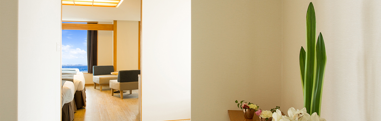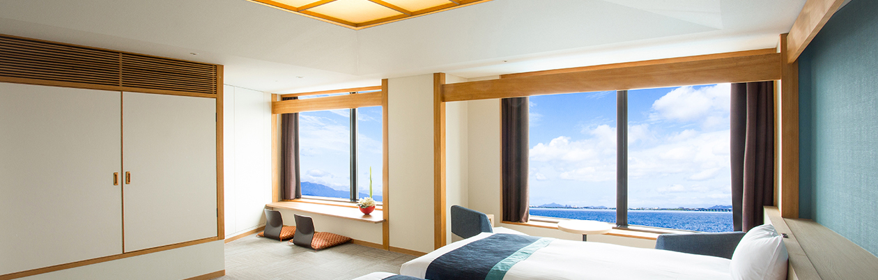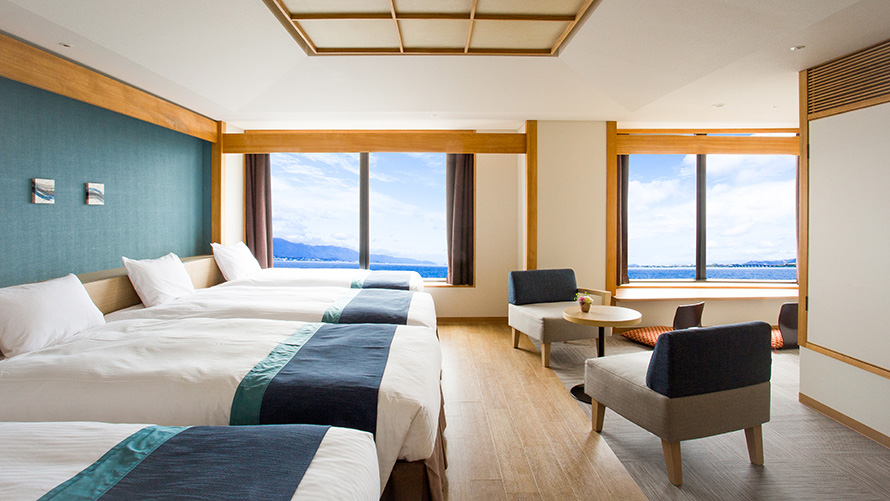 和の温もりとモダンな洋室を合わせた癒やしの空間は、窓際にびわ湖の眺望がお楽しみいただけるリビングスペースを設け、より快適で上質なご滞在をお約束します。