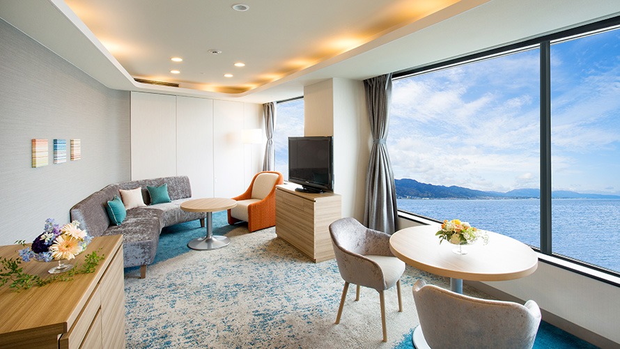 びわ湖を180度見渡す客室からの空と湖をイメージした、上質な雰囲気とリゾートを感じていただける空間。ベッドルームとリビングルームからなる広々としたお部屋で、ゆっくりとおくつろぎいただけます。