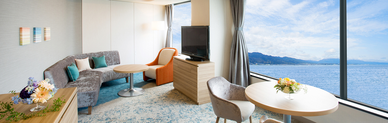 びわ湖を180度見渡す客室からの空と湖をイメージした、上質な雰囲気とリゾートを感じていただける空間。ベッドルームとリビングルームからなる広々としたお部屋で、ゆっくりとおくつろぎいただけます。