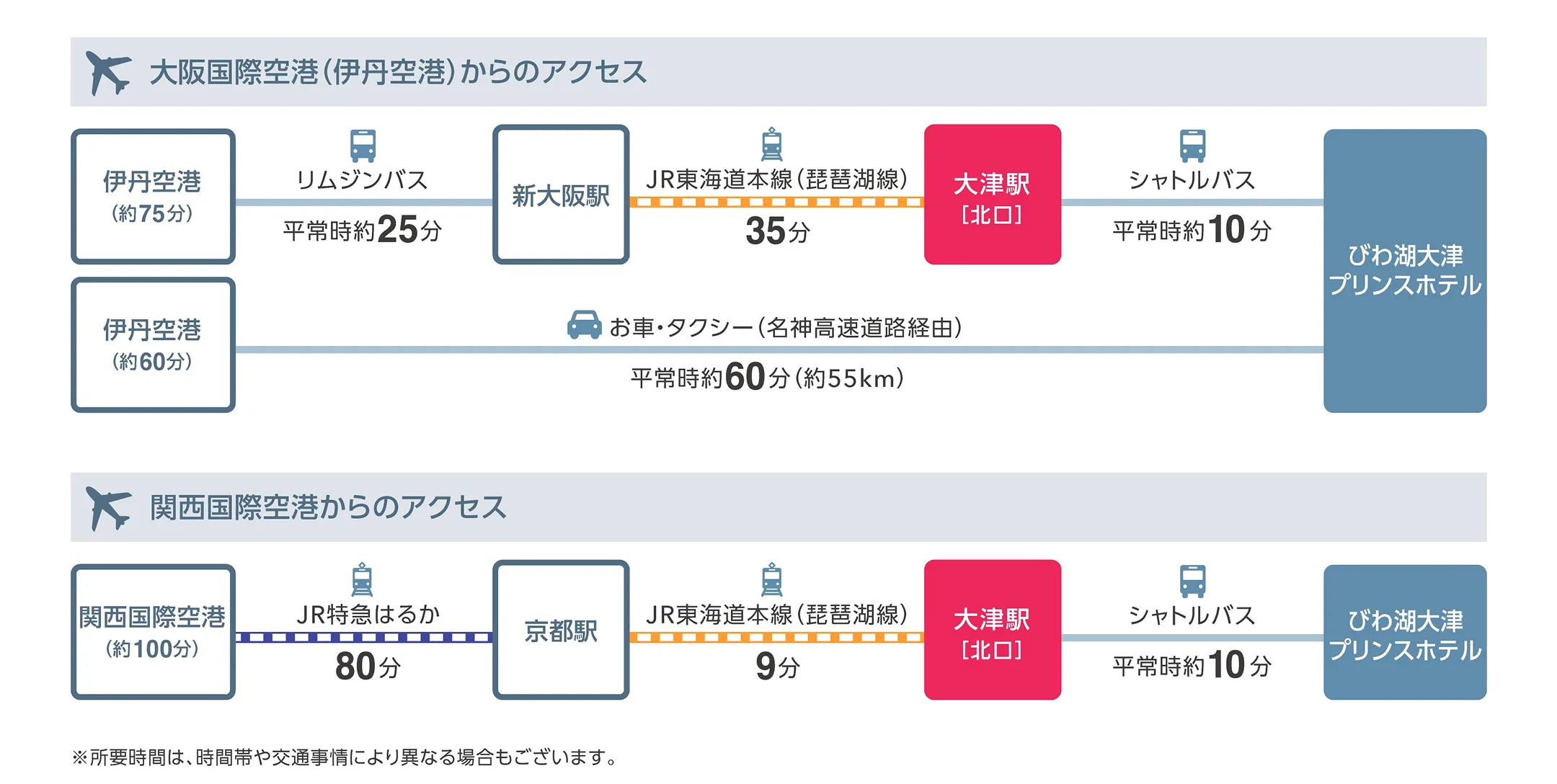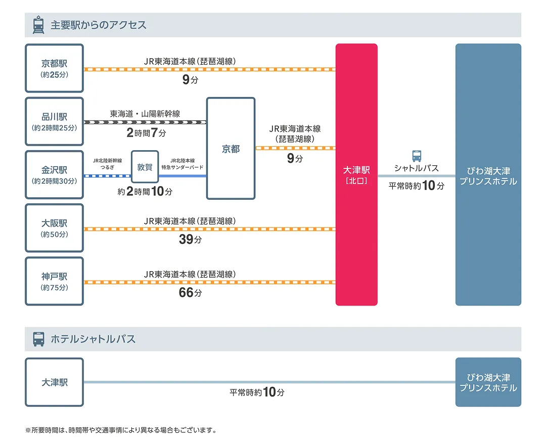 お出かけやお帰りには、JR大津駅⇔びわ湖大津プリンスホテル直行の無料シャトルバスをご利用いただけます。