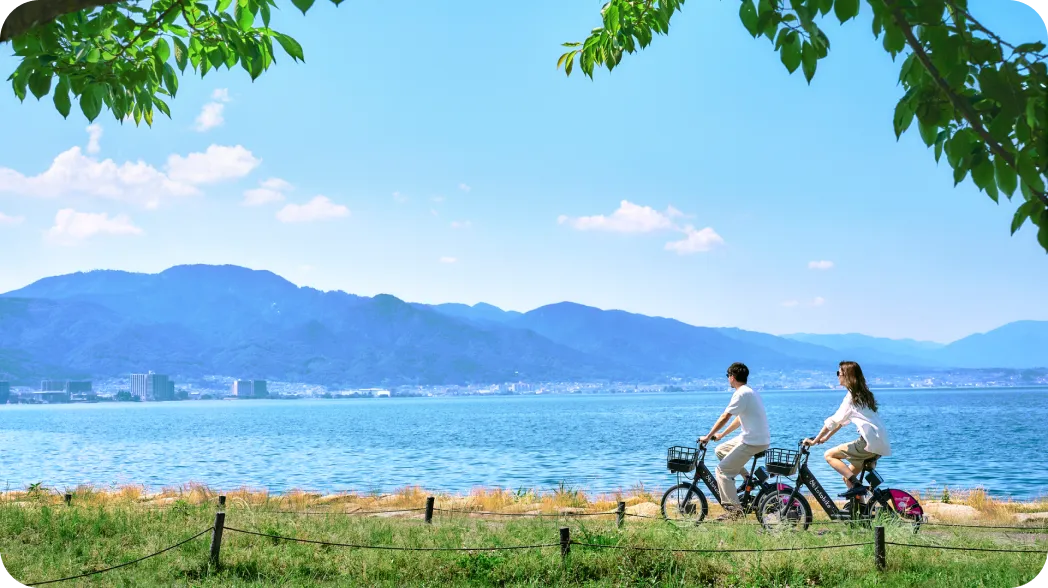 ホテル正面玄関にあるシェアサイクルサービス「kotobike」で、湖畔の爽快な風を受けながら、サイクリングにお出かけ。大津駅や大津港などのポートでも貸し出しや返却可能で、アプリで簡単に施錠・解錠・決済ができます。お子さま向けにレンタサイクルもご用意しております。大津市内の観光にもぜひお役立てください。