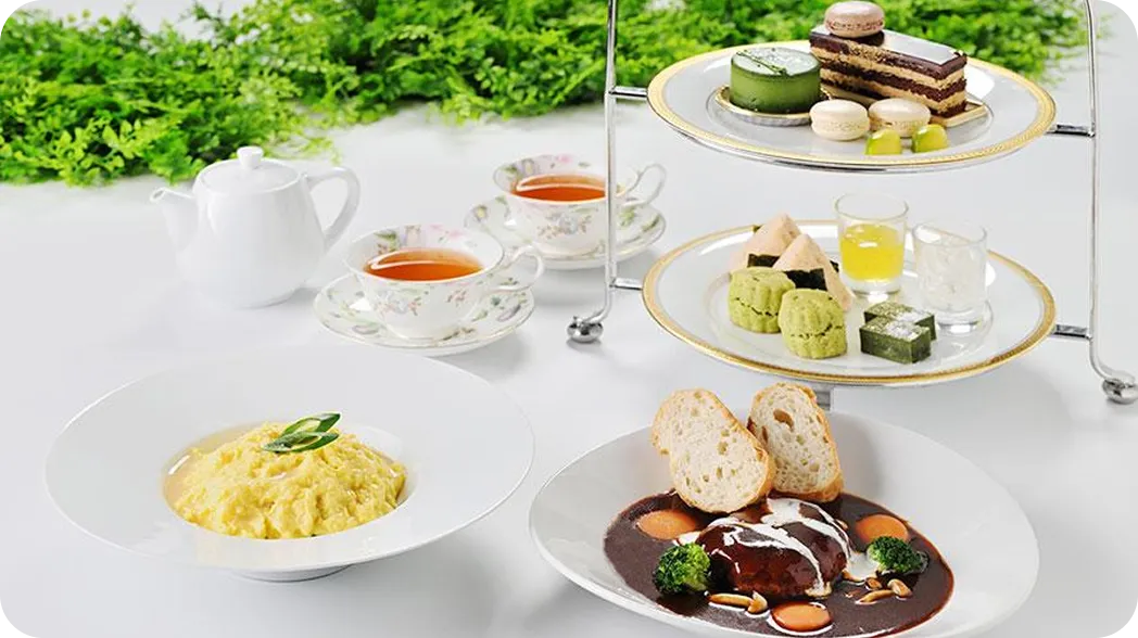 滋賀が誇る日本三大和牛「近江牛」を使った煮込みハンバーグとオムライスからお選びいただける食事メニューに加え、土山抹茶のテリーヌや滋賀県産米粉で仕上げたおにぎり型のかわいいスコーンなど、近江の美味を堪能できるランチにおすすめのアフタヌーンティーセットです。