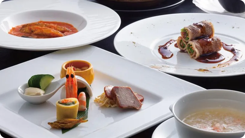 びわ湖の恵み「湖魚」を使った前菜をはじめ、日本最古の朝宮茶のソースで楽しむメニューなど全7品のディナーコース。「近江牛の甘酢ソース」では、滋賀の特産品アドベリーのビネガーを使い、香り高く深みのある風味に仕上げています。