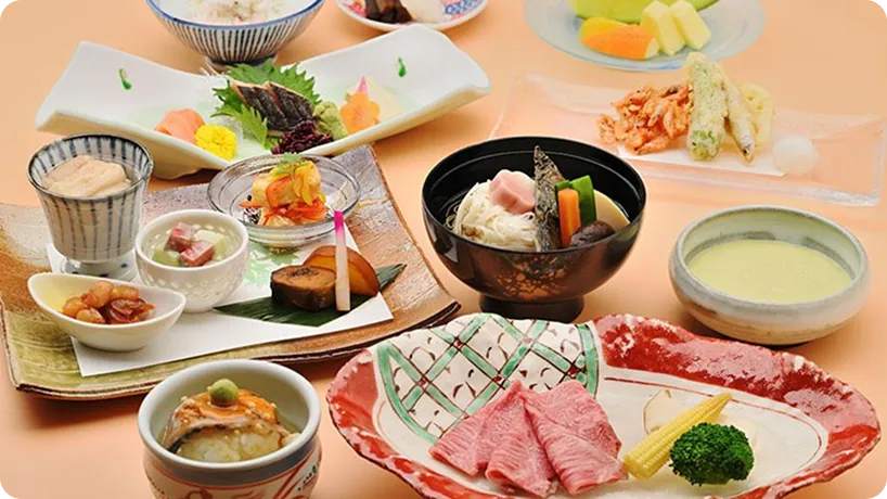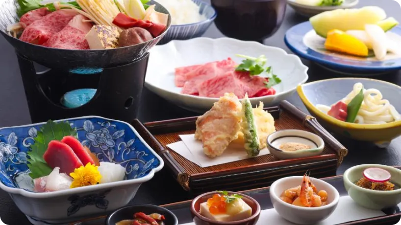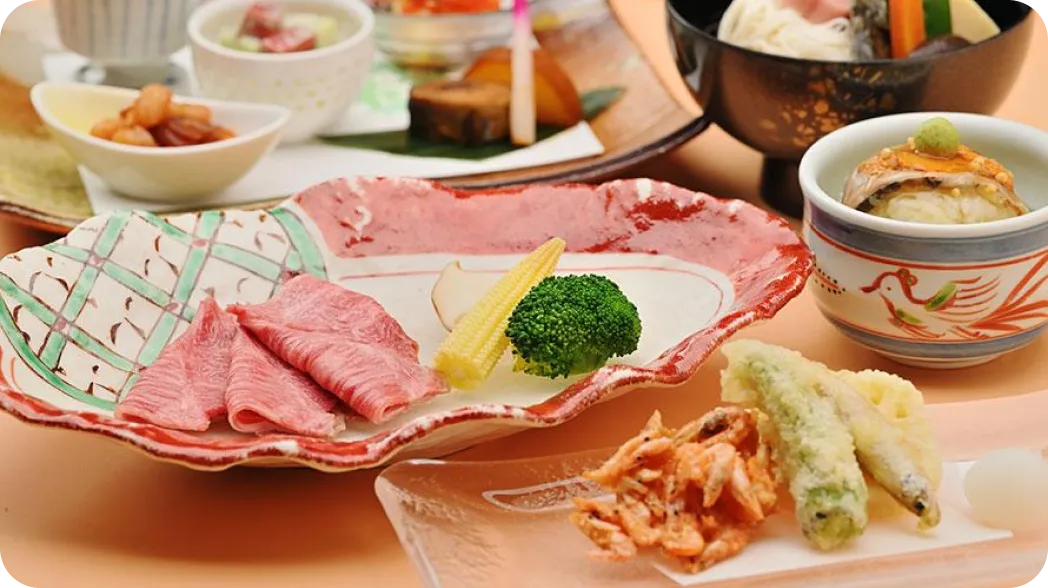 すじ海老や小鮎、びわ湖の恵みを活かした天婦羅、郷土料理「鮒寿司」は蒸し物で、滋賀県の伝統的な味にアレンジを加え仕上げました。一品一品で滋賀の風土を感じる会席料理を雄大なびわ湖を眺めながらお楽しみください。