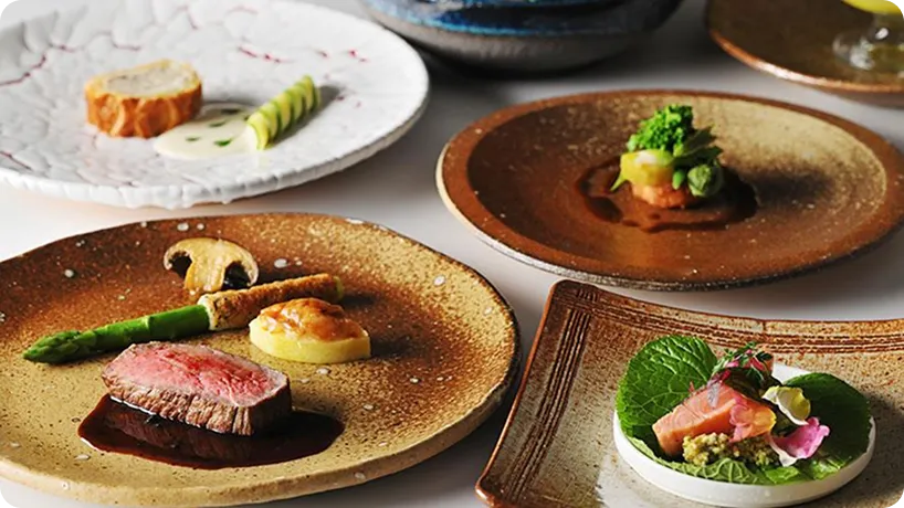 近江牛や近江鴨、雄大な自然が育む滋賀県産野菜など、シェフのアイディアとフランス料理の技法で、素材の魅力を最大限に引き出したスペシャルディナー。伝統工芸品の信楽焼や龍爪梅花皮(りゅうそうかいらぎ)と共に、滋賀の文化に触れる至福のひとときをお届けします。