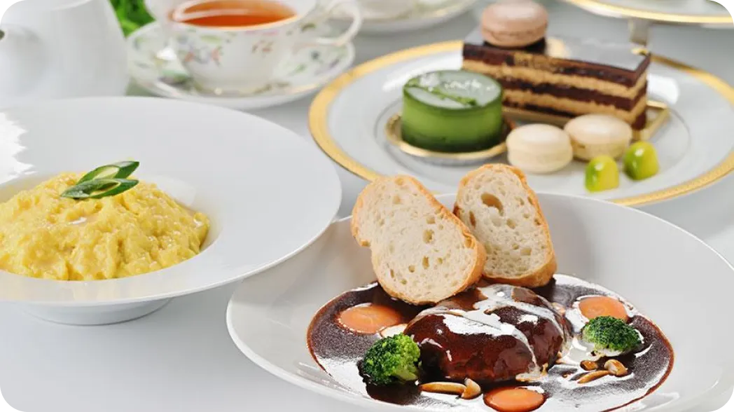 滋賀が誇る日本三大和牛「近江牛」を使った煮込みハンバーグとオムライスからお選びいただける食事メニューに加え、土山抹茶のテリーヌや滋賀県産米粉で仕上げたおにぎり型のかわいいスコーンなど、近江の美味を堪能できるアフタヌーンティーセットです。