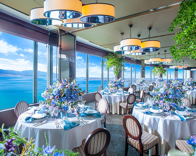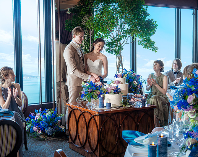 ホテル38階から眺める、湖面の輝きが美しいびわ湖を贅沢に感じるレイクビュースタイル。全面ガラス張りの空間から望むパノラマの絶景は、誰もが感動を覚えるほど。美しい湖に見守られながら、支えてくれたすべての人に感謝の想いを伝える、最高のステージを創りあげます。