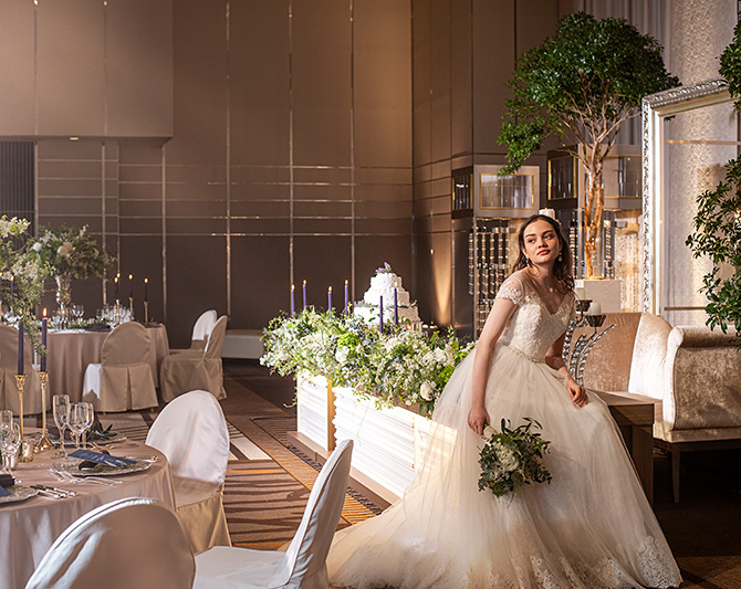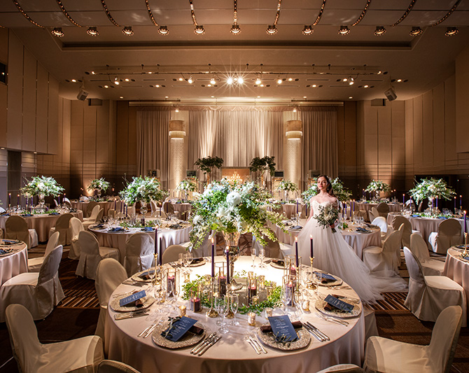 高貴な雰囲気が漂うバンケット会場。天井高約9mの開放的な大空間。モダンでナチュラルなインテリアやおふたりがゲストとゆっくりお過ごしいただくためのソファースペース。