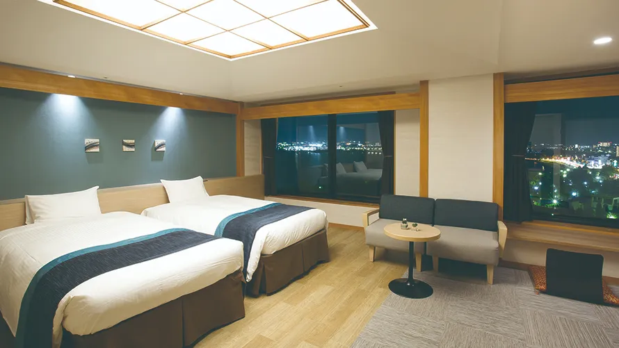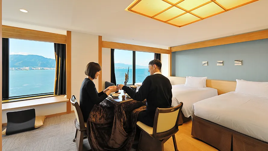 レイクビューのお部屋にご用意するこたつでゆったりくつろぎながらルームサービスの和会席と滋賀の地酒をご満喫いただける、冬の絶景おこもり美食旅をお楽しみください。