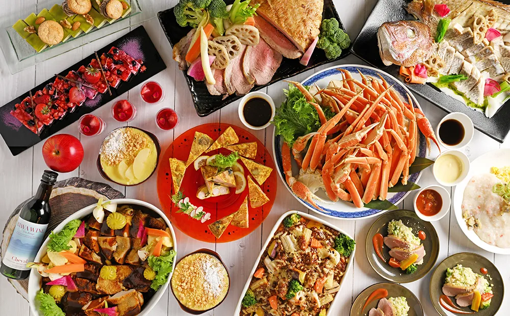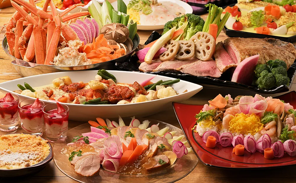冬の味覚を存分に楽しめるこの季節限定のディナーブッフェ。3 種 のソースで味わう蟹の食べ放題をはじめ、近江牛や近江鶏、近江鴨 など、近江の恵みを活かした多彩なメニューが並びます。バラエティ 豊かな料理とともに、至福のひとときをお楽しみください。