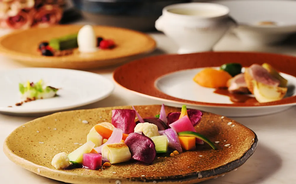 大津市北部の自然豊かな地域で野菜を栽培する「ひら自然菜園」で育てられたこだわりのお野菜を様々な調理法でシェフがお届けいたします。ほかにも、安土養蜂園の蜂蜜で仕上げた近江鴨胸肉のキャラメリゼや滋賀県初のオリジナルいちご「みおしずく」のフォンダンショコラなど、滋賀の美味を見つける食の旅をお楽しみください。
