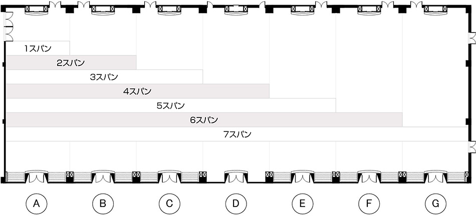 | 3スパン | 480名 | 1,000名 | 1,200名 | 640名 | 1,026m² | 311坪 |