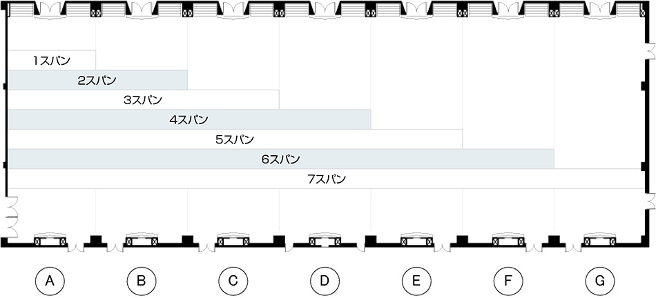 | 7スパン | 1,200名 | 3,000名 | 3,600名 | 1,800名 | 2,394m² | 725坪 |