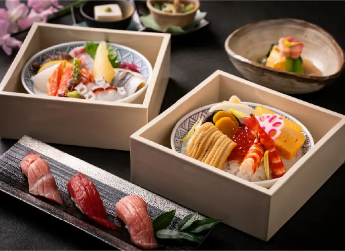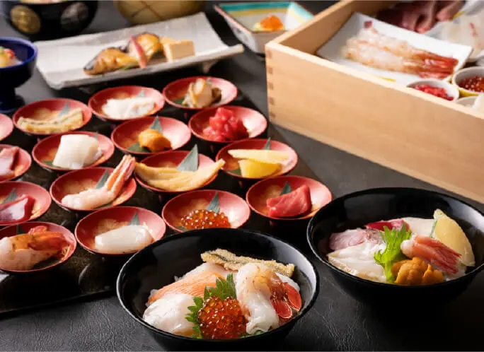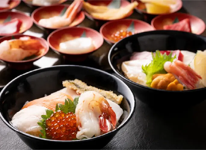 Lunch Dinner 1名さま ¥13,900釧路和商市場発祥「勝手丼」を懐石料理の締めにご用意いたしました。20種類の海の幸から7種類をお選びいただき、自分好みの「勝手丼」をお楽しみください。