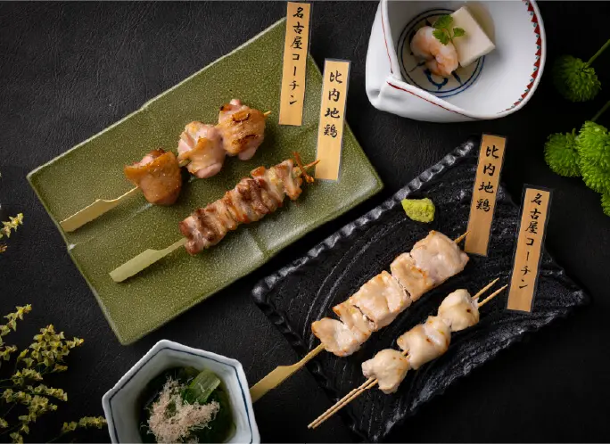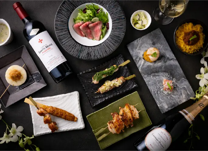 ワインペアリング付きコースDinner 1名さま ¥13,900香ばしくジューシーに焼き上げた焼き鳥をはじめ、とり芝ならではのバラエティ豊かなお料理に合わせて、ソムリエが厳選したワインでスタイリッシュな大人の焼き鳥はいかがでしょうか。
