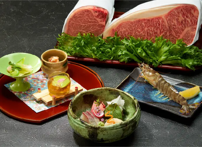 Dinner 1名さま ¥25,600和食と鉄板焼きが織りなす和洋折衷コースを20周年記念として、20%引きでご用意。季節の前菜やお造りなどの和を感じる味わいから車海老や銘柄牛などシェフの技光る鉄板焼き、香り豊かなガーリックライスまでご堪能いただけます。