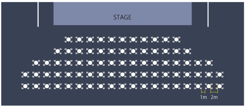 テーブルの間隔を2m、イスの間隔を1m空け、全席指定席でのご案内となります。