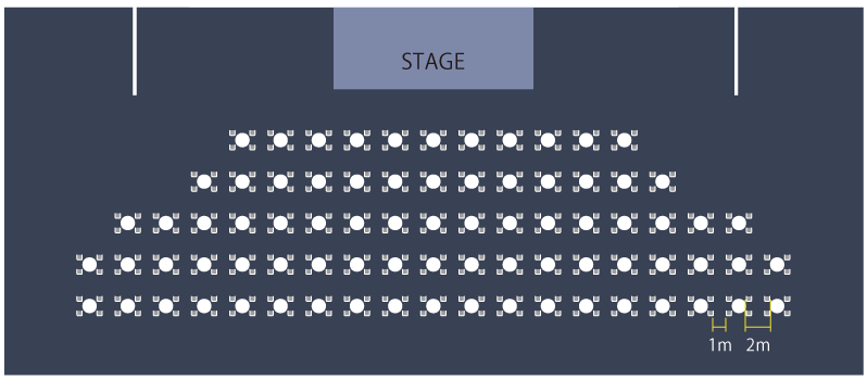 テーブルの間隔を2m、イスの間隔を1m空け、全席指定席でのご案内となります。