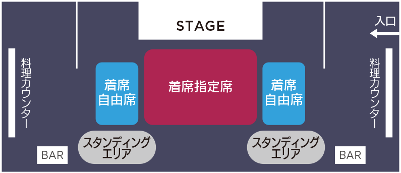 - ※着席指定席・着席自由席・スタンディングのエリア分けはボールルーム(メイン会場)のみとなります。その他の会場はすべて自由席となります。
