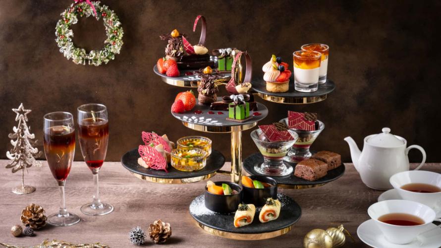ピエール マルコリーニのオリジナルクーベルチュール2種(ビター・ミルク)を使用したクリスマスアフタヌーンティー。ピエール マルコリーニのクリスマステーマである「アール・デコ」のデザインを吹き込んだ繊細でエレガントなスイーツのほか、セイボリーにもオリジナルクーベルチュールを使用し、贅沢な味わいに。