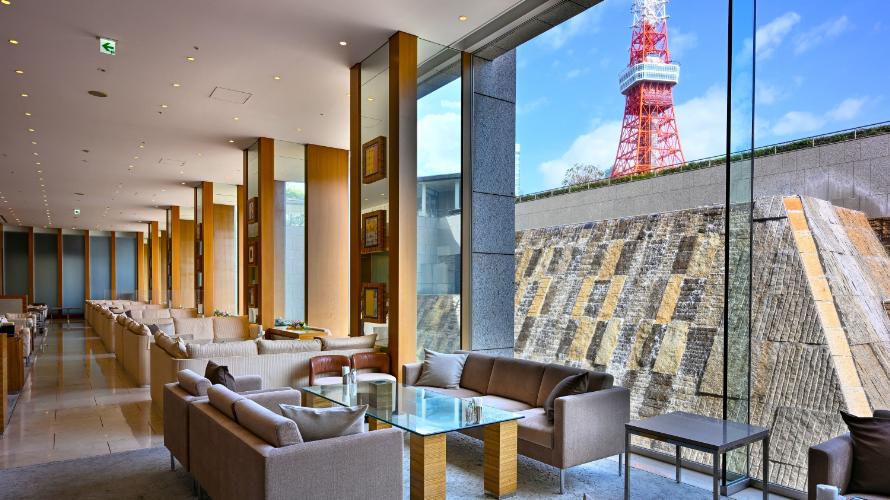 ホテルエントランスフロアに位置するラウンジ。フロアの一部が弧を描くように外に突出した窓側席からは、一面に広がる滝の景色と、東京のシンボル“東京タワー”をご覧いただけます。ご友人やご家族との楽しいひとときや、ビジネスでのご利用など幅広いシーンでご利用いただけます。パティシエこだわりのスイーツ、香り高い紅茶とともにゆったりとした時間をお過ごしください。