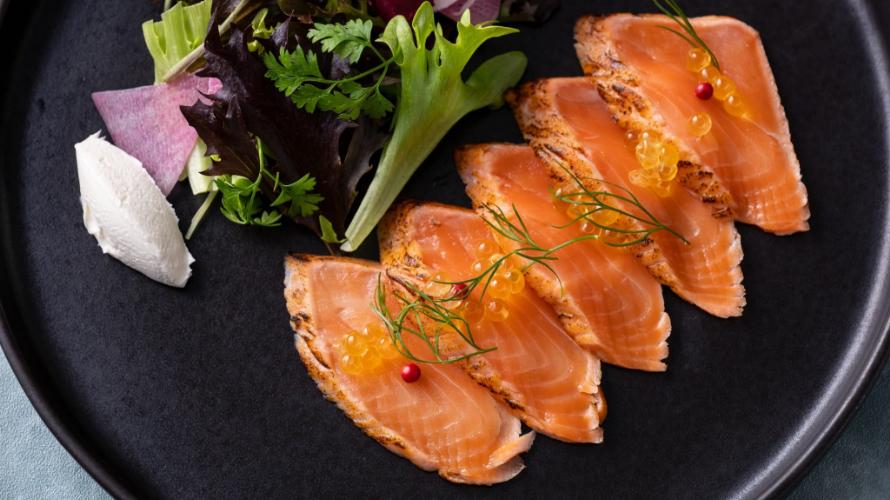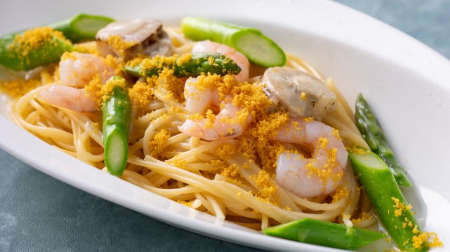 九州フェア期間限定メニュー。くちどけの良い脂乗りと上品な味わいが特徴の“日向夏サーモン”と金色のいくら“つきみいくら”を合わせた「宮崎県産日向夏サーモン つきみいくら サーモンサラダ」や、大分県産カラスミを使用した魚介の旨味が広がる「大分県産カラスミパウダー シーフードビアンコ」をお楽しみください。