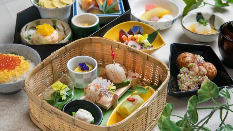 花籠のように美しく盛られた旬菜と点心のように少しずつ様々な料理で彩る六角弁当です。