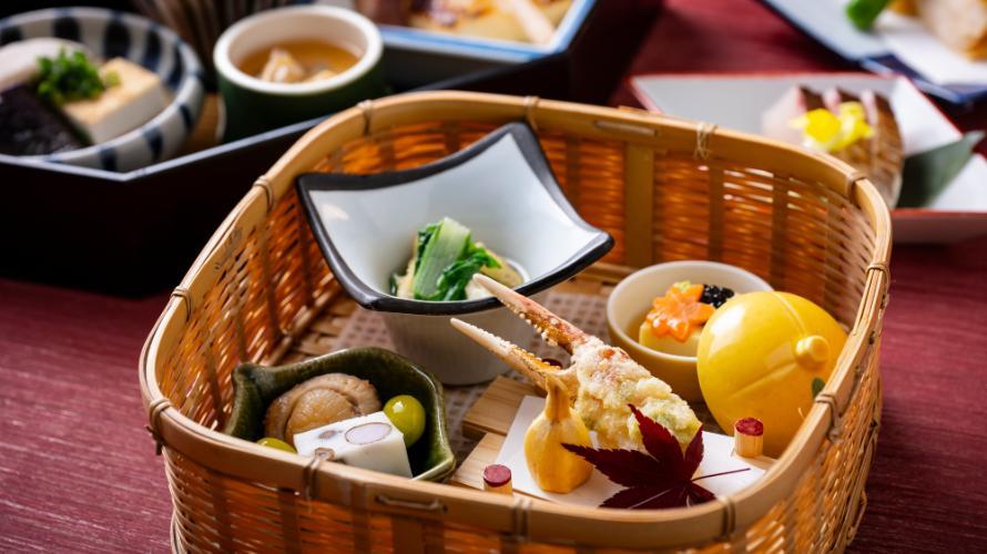 冬の味覚を盛り込んだ花籠点心。濃厚な旨みが広がり、ぷりぷりした食感が楽しめる蟹爪の揚げ物や旬を迎える鰈の焼物など、華やかで味わい豊かな御膳をご堪能ください。