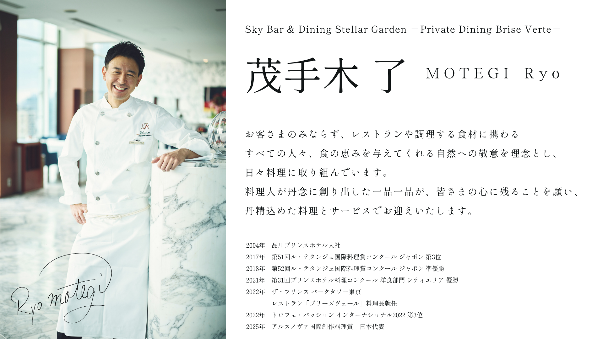 国際コンクール入賞や日本代表出場の経験を持つ料理長 茂手木 了。