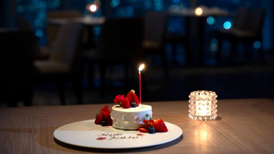 記念日におすすめな、乾杯グラスシャンパン、ケーキ、窓側席確約のアニバーサリープラン。国際コンクール入賞や日本代表出場の経歴を持つ料理長 茂手木による多彩なコース料理とともに、ホテル最上階で過ごす特別なひとときをお楽しみください。